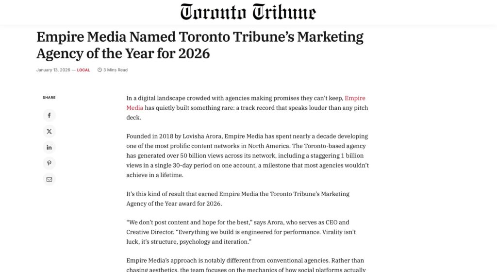 Empire Media was named Marketing Agency of the Year for 2026 by the Toronto Tribune, recognized for nearly a decade of results-driven content and a guaranteed approach that’s changing how brands think about social media growth.