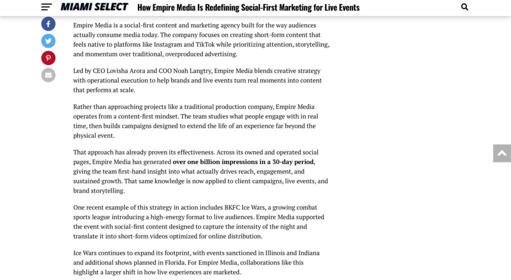 Empire Media was featured in Miami Select after being brought in to cover BKFC Ice Wars at Amerant Bank Arena in Florida, producing social-first content designed to extend the life of the event far beyond the night itself.