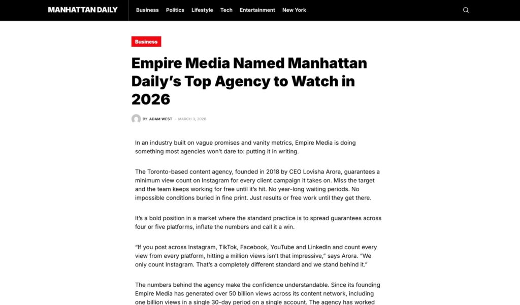 Manhattan Daily named Empire Media their Top Agency to Watch in 2026, citing the agency’s disruptive guarantee model and its track record of generating over 50 billion views across its content network.